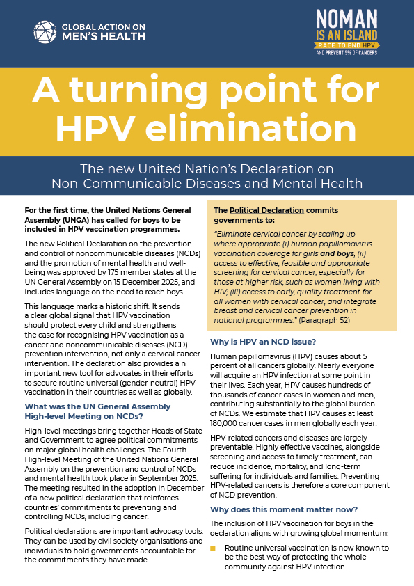 The new Political Declaration on the prevention and control of noncommunicable diseases (NCDs) and the promotion of mental health and well-being was approved by 175 member states at the UN General Assembly on 15 December 2025, and includes language on the need to reach boys. This language marks a historic shift. It sends a clear global signal that HPV vaccination should protect every child, girls and boys.